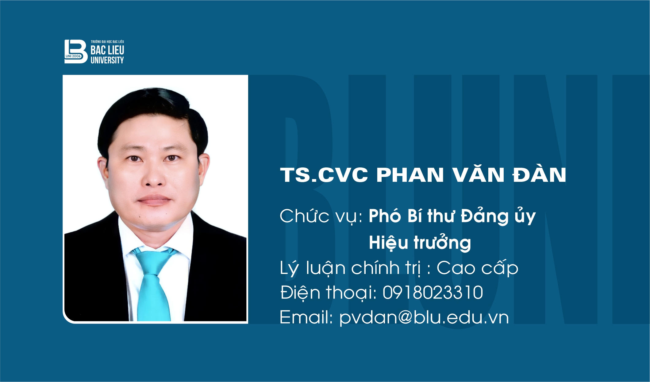 Bí thư Đảng ủy | Chủ tịch Hội đồng trường | Tiến sĩ | ndluu@blu.edu.vn | 0913610007 |
